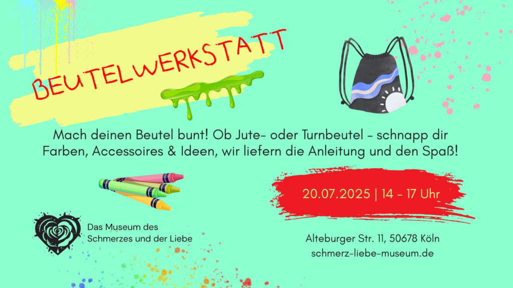 Hinweis: Der Preis ist bis 25 Jahre frei. Für den Workshop um 19:00 Uhr bitte per Mail (info@schmerzliebemuseum.de) oder über Instagram (schmerz_liebe_museum) anmelden. Für den Museumsbesuch ab 17 Uhr ist keine Anmeldung erforderlich.